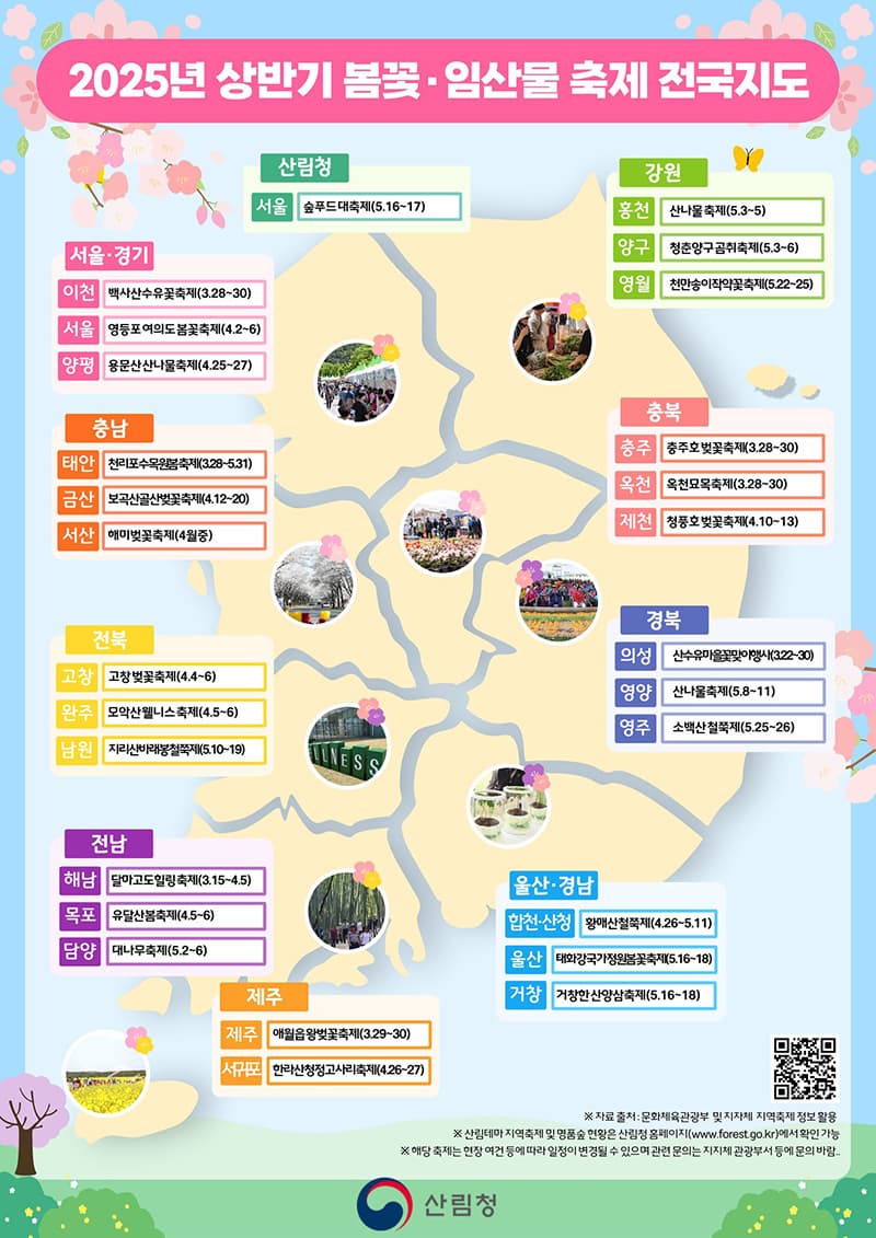 이번 글에서는 2025년 상반기 봄꽃 및 임산물 축제를 한눈에 볼 수 있도록 전국 지도를 정리해 소개합니다. 여행을 계획하고 있다면 꼭 참고해 보세요!